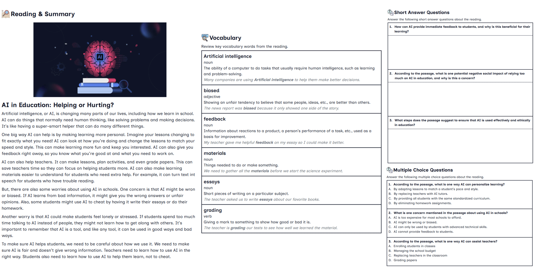 It takes any article, paragraph, or link and turns it into ready-to-use learning materials — summaries, comprehension questions, vocabulary lists, and even simplified versions for different reading levels.