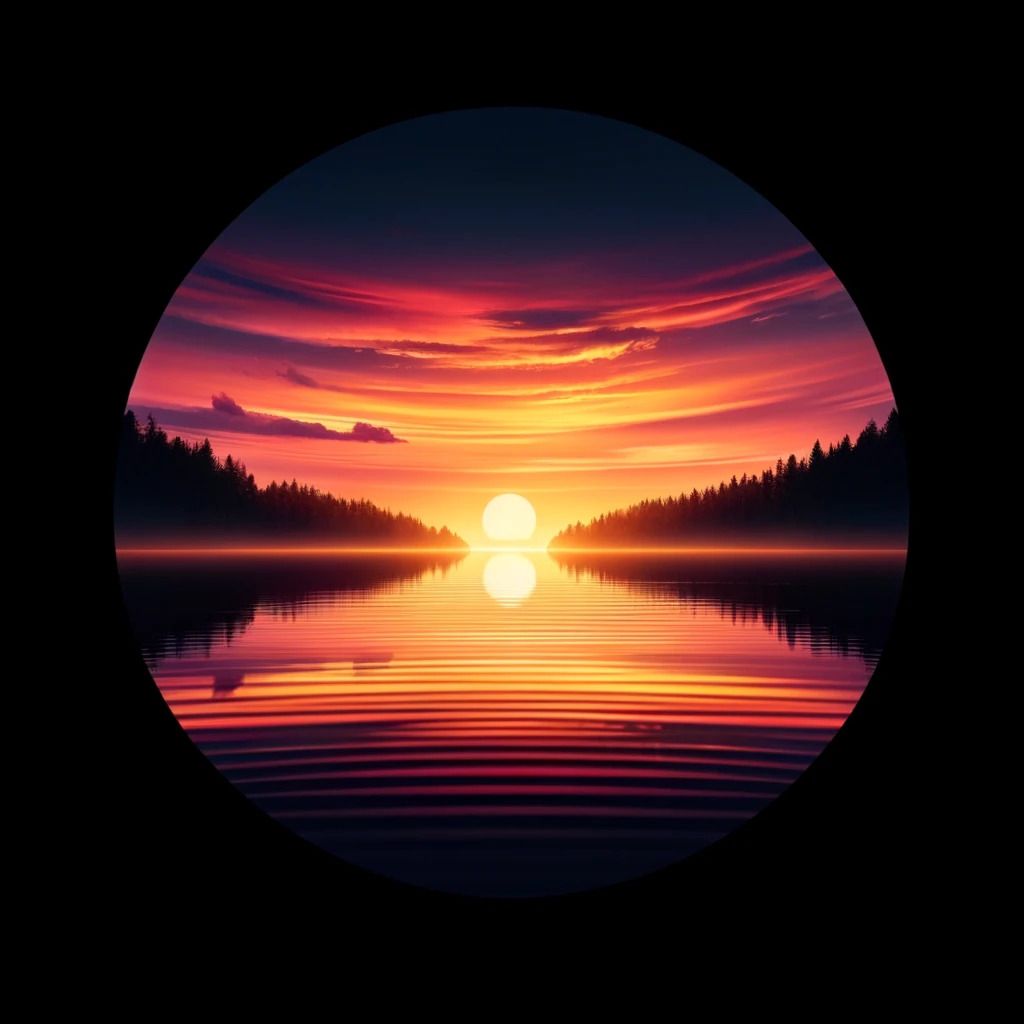 “Create a captivating image capturing the beauty of a sunrise or sunset over a tranquil lake, with warm hues reflecting off the water's surface. Give it a completely black background and edges to fit right into my website.”