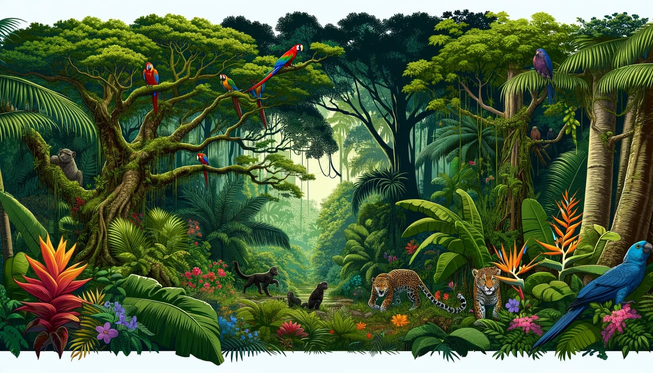 Example: “Create an illustration featuring a variety of native plants and animals found in a tropical rainforest ecosystem. Make it as an horizontal website banner.”