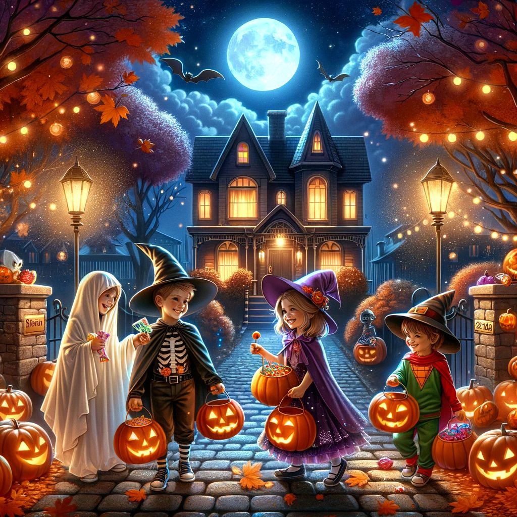 Prompt: "Design a whimsical Halloween night scene with children in costumes trick-or-treating in a friendly neighborhood. Include jack-o’-lanterns, a full moon, and a spooky but inviting haunted house in the background."