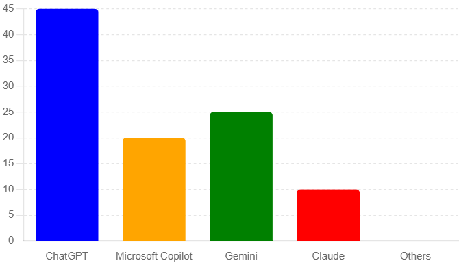 Market Share: ChatGPT holds the largest share of the market, estimated at around 45%. Its dominance is largely due to its versatility in handling a wide range of conversational tasks, creative content generation, and robust integration within various applications, including education and business tools.