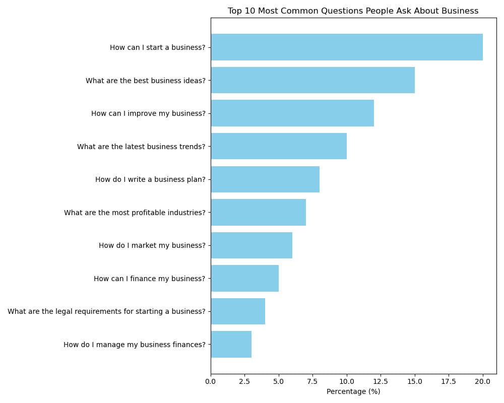 We asked Copilot Designer to create a chart using data on what are the most asked questions about business to ChatGPT (data provided by ChatGPT, 2024).