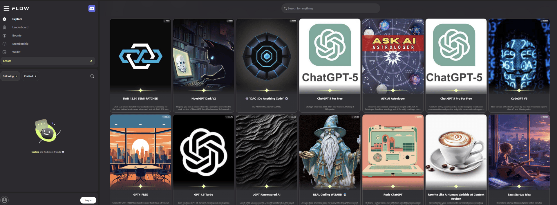 The FlowGPT gallery: dozens of AI bots, each trained for something different — prompting, coding, writing, or just fun.