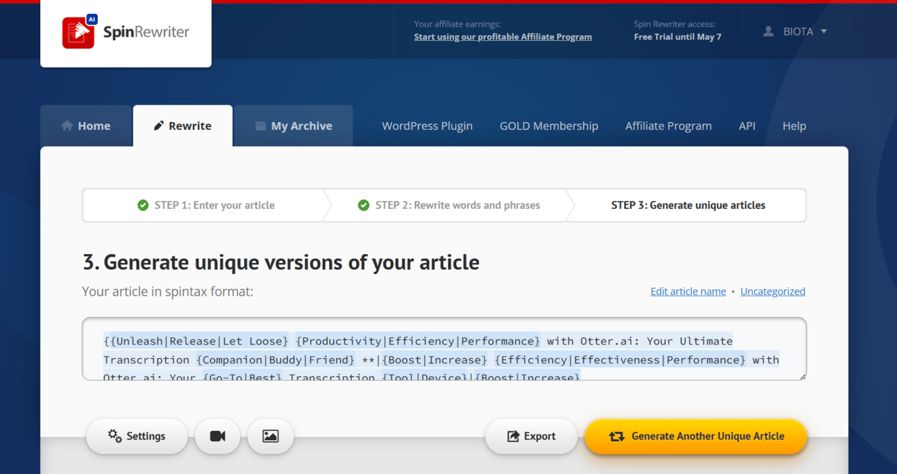Choose how much change you want. SpinRewriter offers settings from light spinning (keeping most of the text intact) to deep spinning (complete overhaul).
