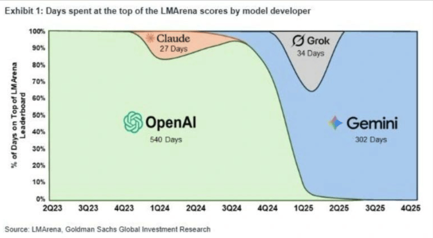 The competition here is about who has the smartest AI model at any time. OpenAI was ahead for most of the time, Claude and Grok had their hit at the throne, but Gemini is just crushing it through 2025.