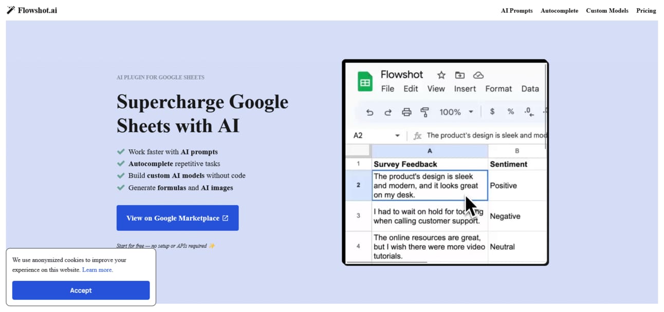 “AI in Sheets” by Flowshot takes automation to the next level. It allows you to use AI prompts, autocomplete tasks, and even create custom models.