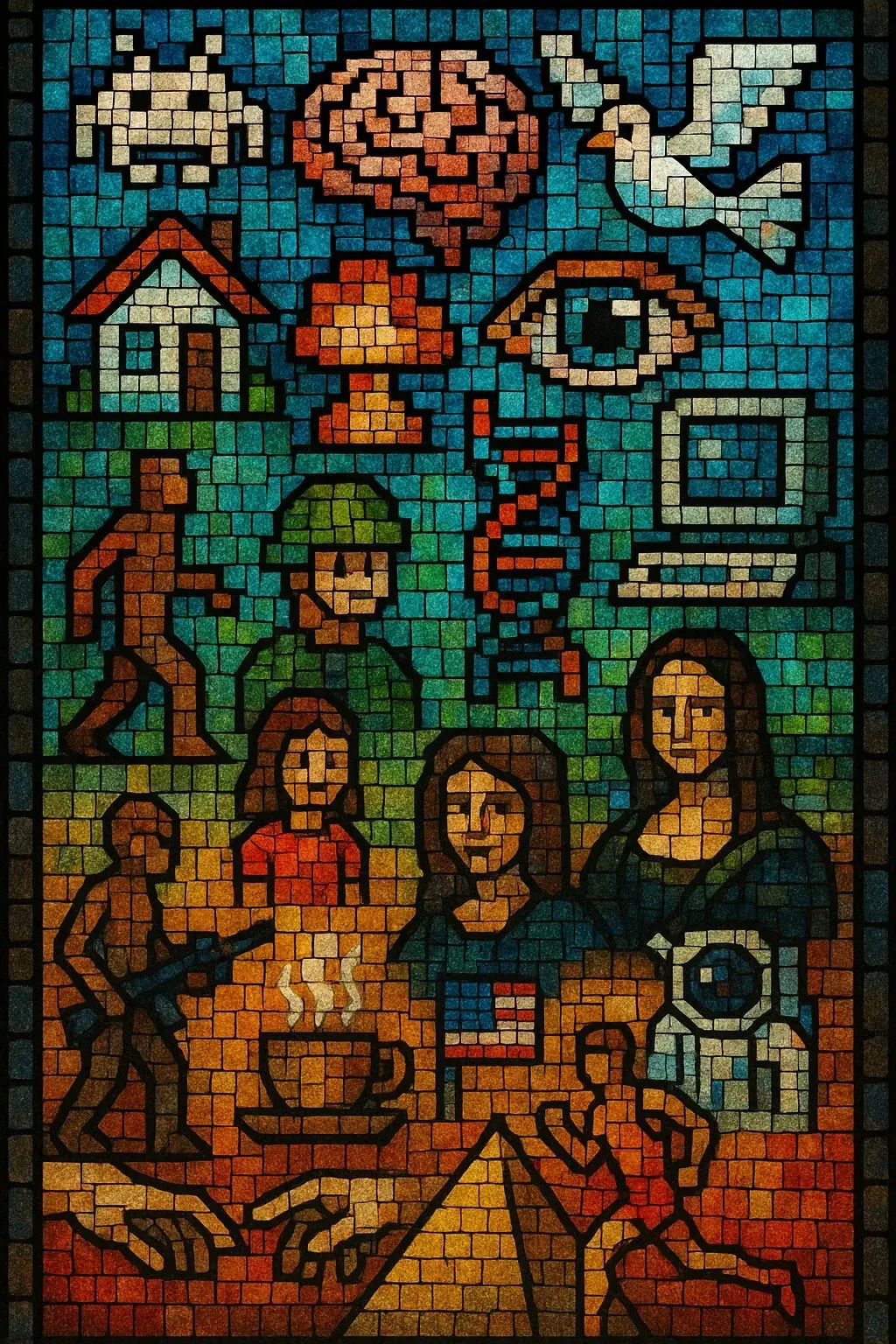 “A composite mural of collective human memory in 8-bit glass shards.”